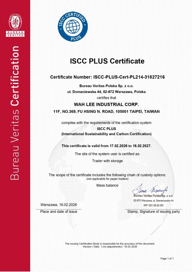 国际永续性与碳验证(ISCC PLUS)认证,证书编号:ISCC-PLUS-Cert-PL214-38127216